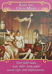 Keep an open mind 카드는 새로운 인연에 대해 열린 마음을 가질 것을 격려하는 카드입니다. 카드 이미지에는 남자와 여자, 그리고 두 명의 아기 천사가 있습니다.