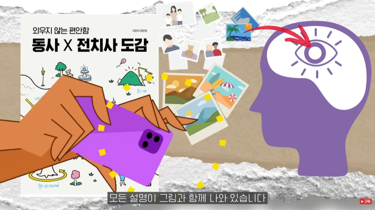 '외우지 않는 편안함 동사 X 전치사 도감' 책을 소개하는 영상이예요.