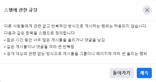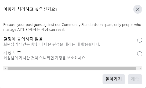 페이스북 로그인하니까 이런게 뜨네요. "회원님의 게시물 2개가 스팸에 관한 규정을 위반합니다"