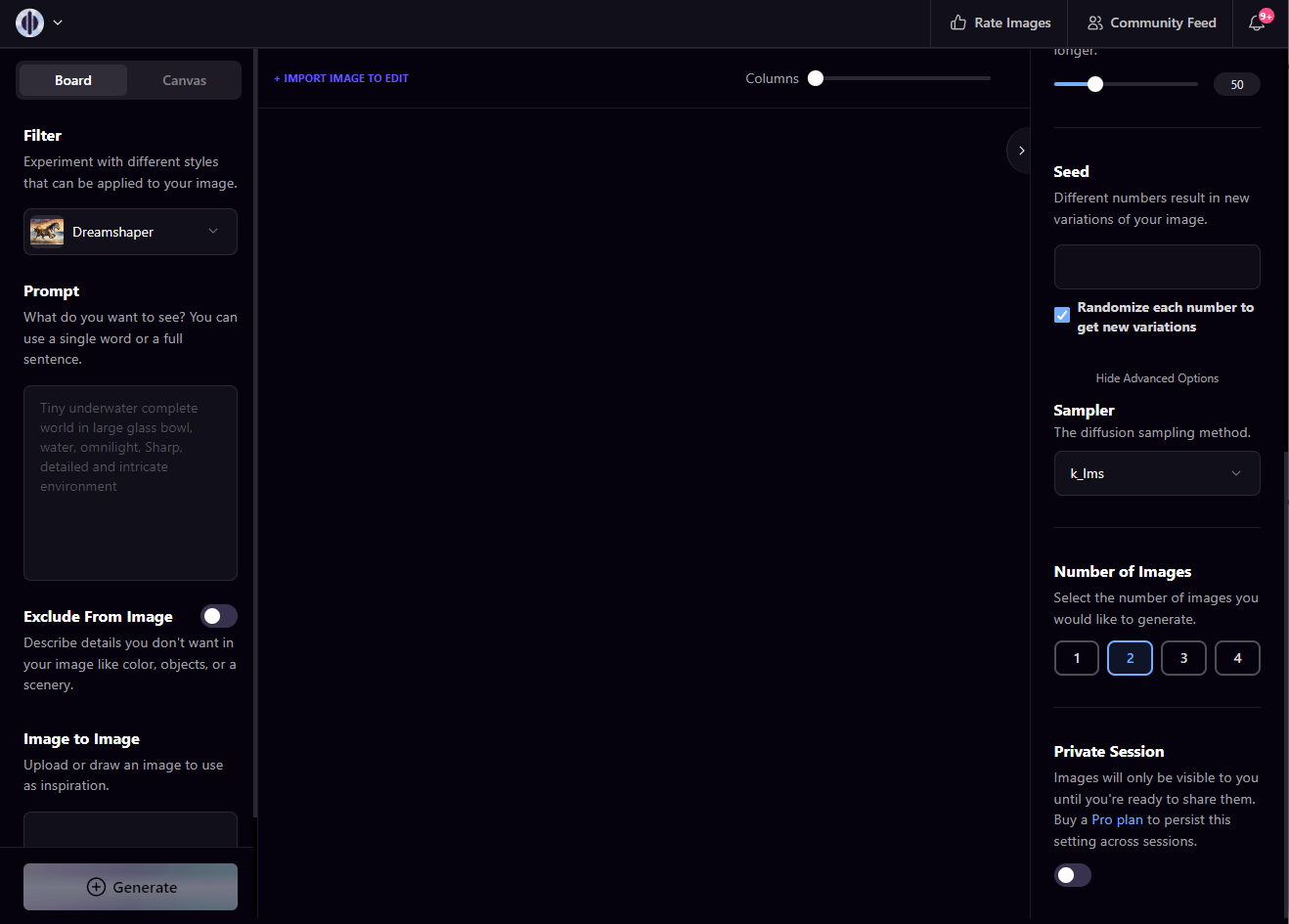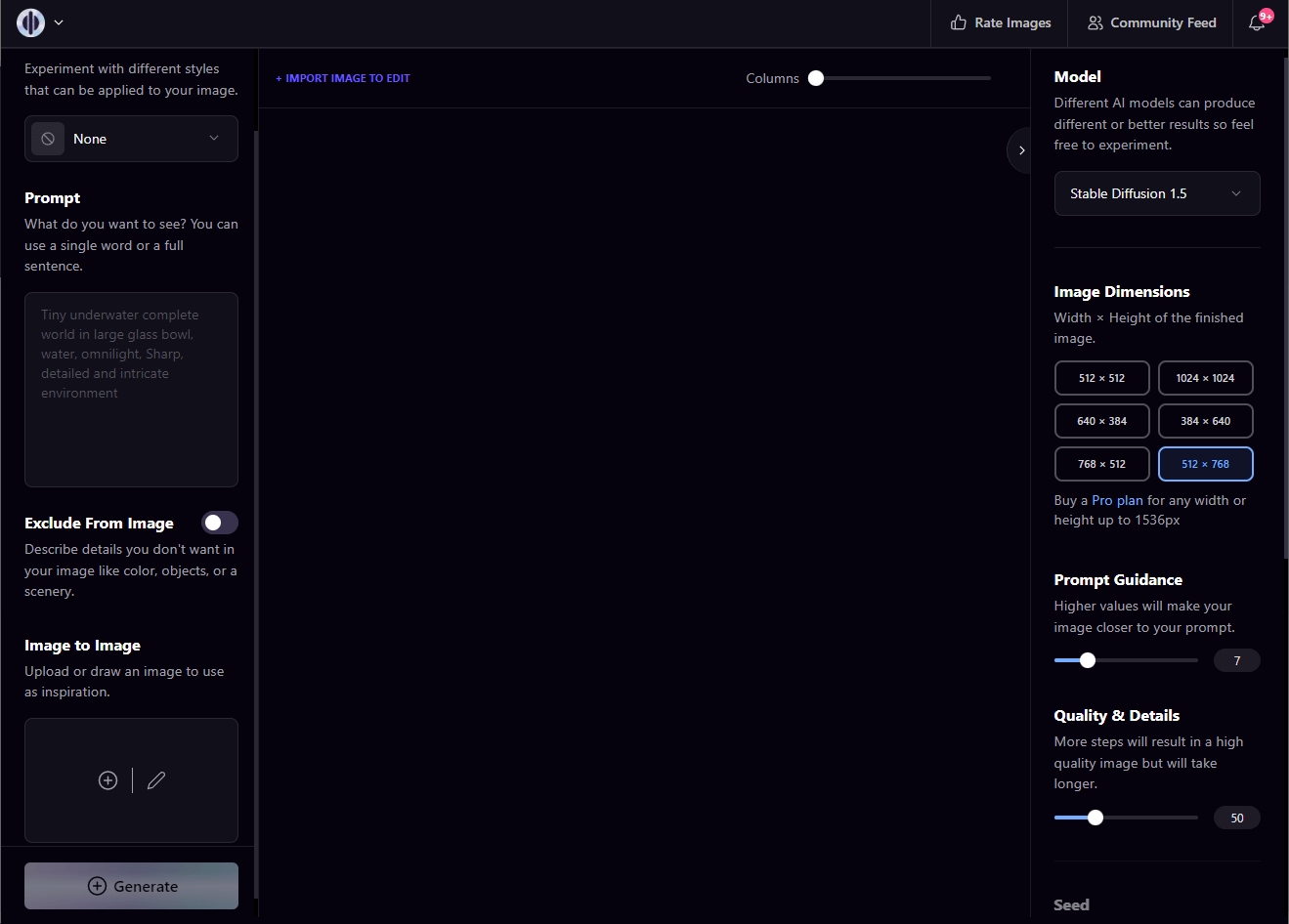 우측 상단의 Create 버튼을 클릭하면, AI 그림을 생성할 수 있는 UI 화면이 뜹니다.