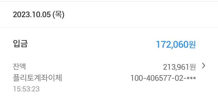 20만원을 송금 요청했더니 172,060원이 입금되었습니다.